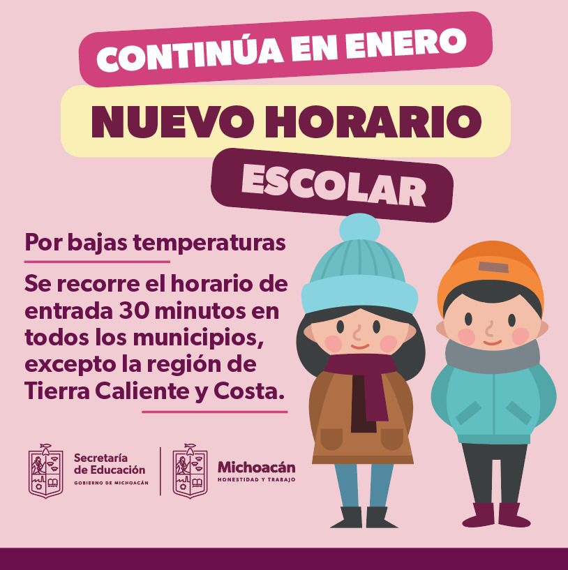 El ingreso a escuelas de nivel básico se recorrió media hora a inicios de diciembre, medida que se mantendrá durante el mes de enero y con posibilidad de que se extienda más tiempo, de acuerdo a las valoraciones que se realizan en conjunto con la Secretaría de Salud de Michoacán (SSM).
