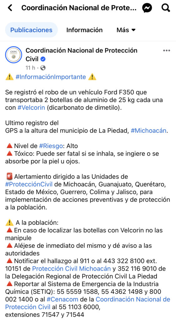 La CNPC informó que la sustancia se conoce como Velcorin y es peligrosa, por lo que se ha alertado a los sistemas de Protección Civil de Michoacán, Jalisco, Guanajuato, Colima, Estado de México, Guerrero y Querétaro, para en caso de ser detectada, proceder de inmediato a su intervención.