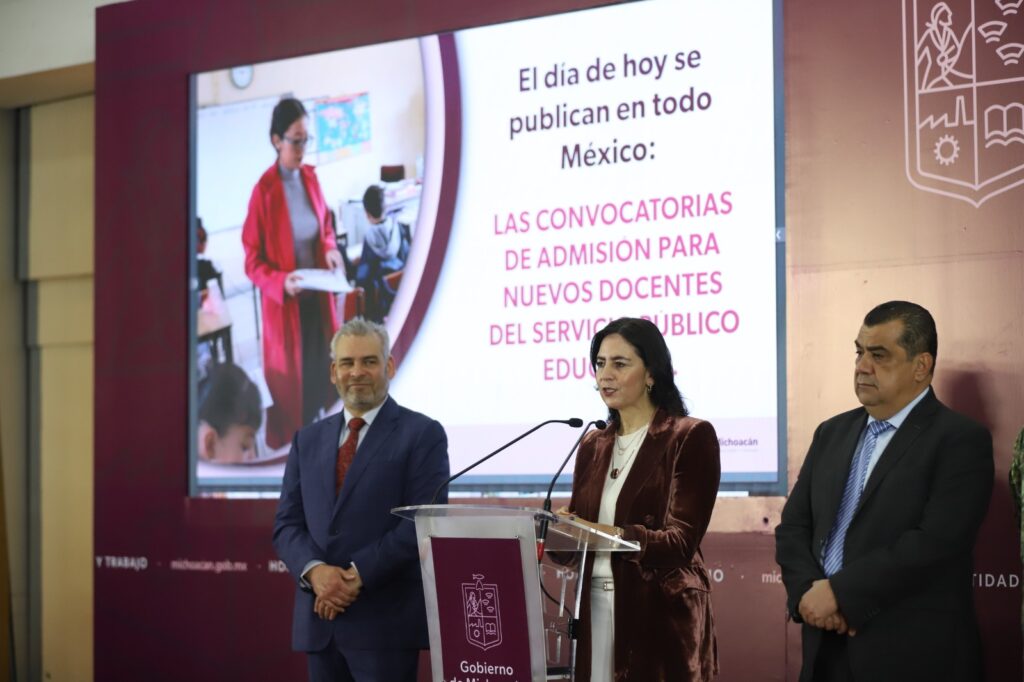 Este lunes se publican a nivel nacional las convocatorias de admisión para nuevos docentes del servicio público educativo, y en próximas horas se dará a conocer la correspondiente a Michoacán que prevé pueda sumar a alrededor de mil docentes a las aulas michoacanas, informaron el gobernador Alfredo Ramírez Bedolla y la secretaria Gabriela Molina Aguilar.