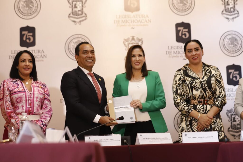 La presidenta de la Mesa Directiva del Congreso del Estado, Ivonne Pantoja Abascal, recibió el Quinto Informe Anual de Resultados del Plan de Persecución de Delitos de la Fiscalía General del Estado, de manos del titular de la corporación, Adrián López Solís.