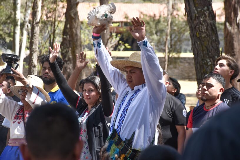 Desde la zona arqueológica, mujeres portadoras del fuego levantaron el humo del copal y ofrendaron su palabra. “Aquí y ahora está la esencia de nuestro corazón y nuestra habla; por eso están los que cantan, los que bailan y los que tocan con el espíritu de nuestros ancestros y ancestras; por eso estamos aquí hoy para pedirles permiso”, dijo Nana Josefina Chávez Guerrero, de Cherán.