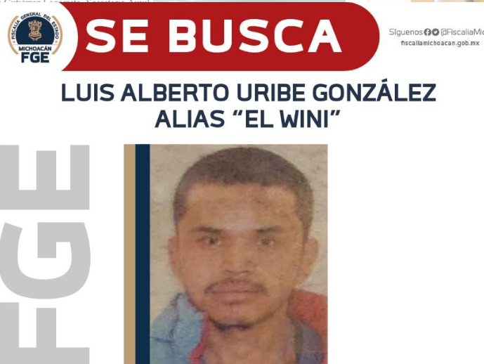 Producto investigaciones realizados por la Fiscalía General del Estado de Michoacán, con relación al homicidio de Armando Pérez Luna, precandidato del PAN a la presidencia municipal de Maravatío, ocurrido el pasado 27 de febrero, se logró establecer la presunta autoría material de Luis Alberto Uribe González, el Wini, por lo que emitió cédula de ofrecimiento de recompensa para quien proporcione información que permita su detención.
