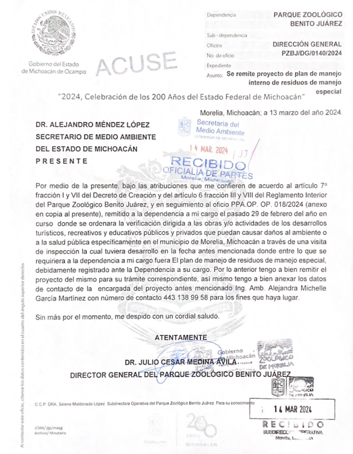 Indicó que El Zoológico de Morelia es una institución que trabaja día a día por ser una institución ambientalmente responsable, con el compromiso de realizar acciones sostenibles que lleven a regularizar el manejo de los residuos sólidos, por lo que se tiene un proyecto que ya se presentó a la Procuraduría de Protección al Ambiente (Proam).