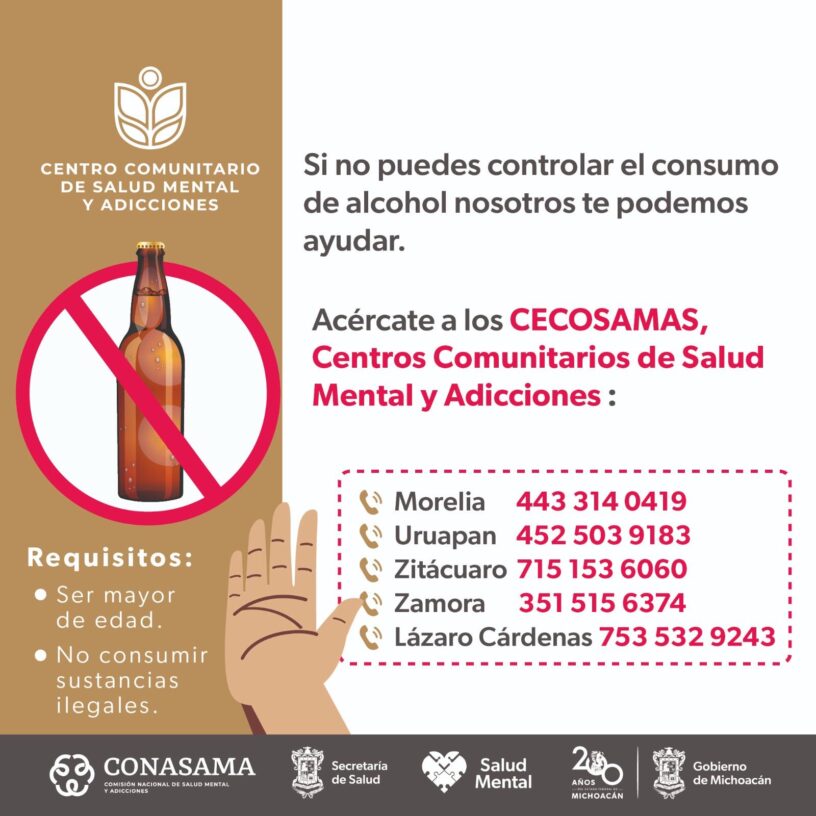 Si deseas superar la adicción al alcohol puedes solicitar ayuda profesional sin costo en uno de los cinco Centros Comunitarios de Salud Mental y Adicciones (Cecosama) de la Secretaría de Salud de Michoacán (SSM), ubicados en Morelia, Zamora, Zitácuaro, Lázaro Cárdenas y Uruapan.