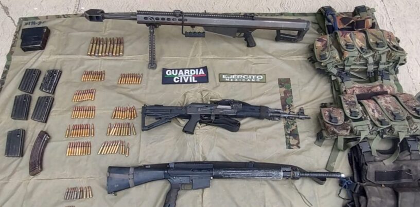 Efectivos de las secretarías de Seguridad Pública (SSP) y de la Defensa Nacional (Sedena) detuvieron en el municipio de Buenavista a dos hombres de nacionalidad colombiana, en posesión de tres fusiles, uno de ellos calibre .50 antiblindaje.