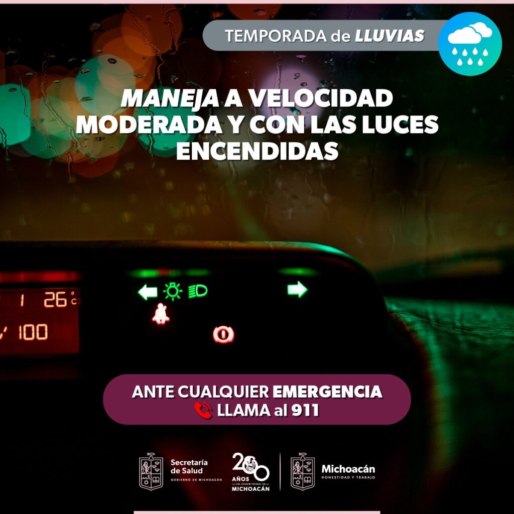 En esta temporada de lluvias, la Secretaría de Salud de Michoacán (SSM) recomienda a automovilistas y motociclistas respetar los límites de velocidad y verificar el estado de los frenos, llantas y limpiaparabrisas de sus unidades, para prevenir accidentes viales.
