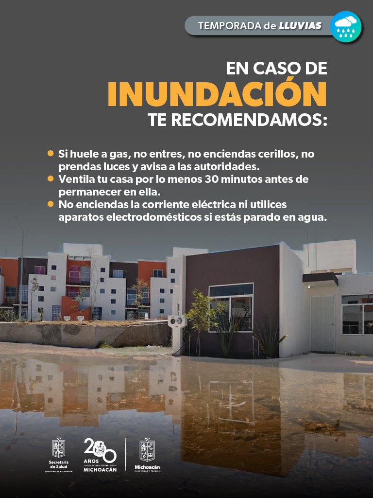 Tras la tromba registrada esta tarde en Morelia, la Secretaría de Salud de Michoacán (SSM) emite las siguientes recomendaciones en caso de inundación en tu vivienda.