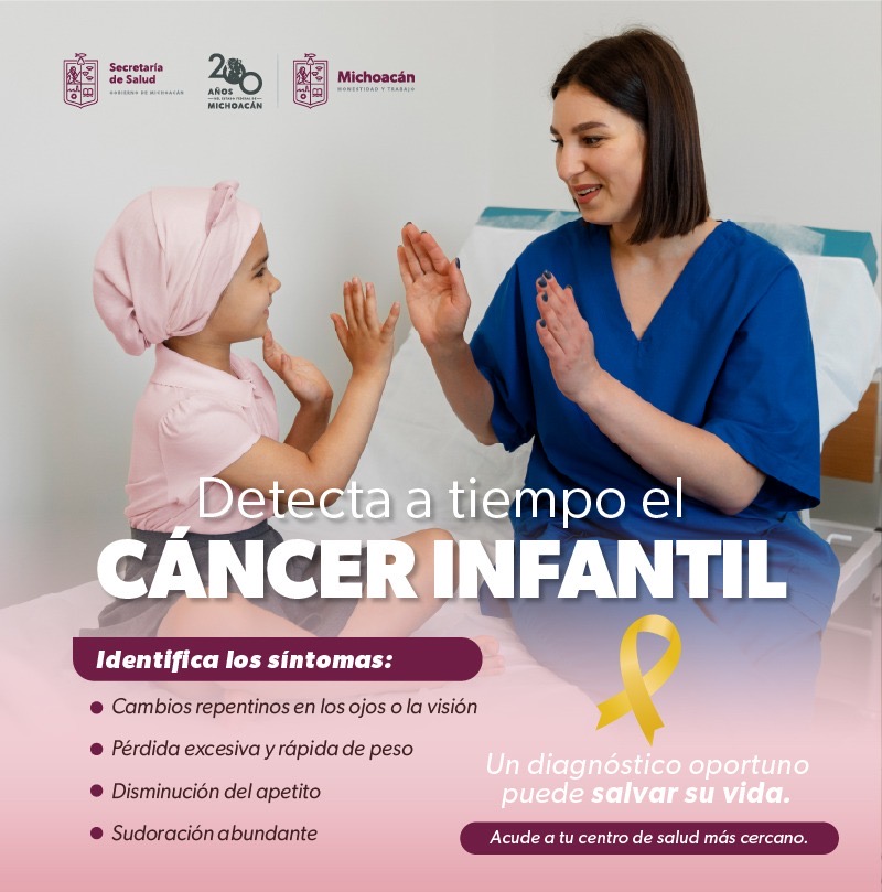 Para detectar el cáncer infantil a tiempo, es importante que padres y madres lleven a sus hijas e hijos al médico si observan síntomas como fiebre recurrente que no cede con medicamentos, crecimiento anormal del abdomen, moretones o manchas rojas o moradas en la piel, dolor de huesos, sangrados frecuentes de nariz y encías, debilidad y pérdida del apetito.