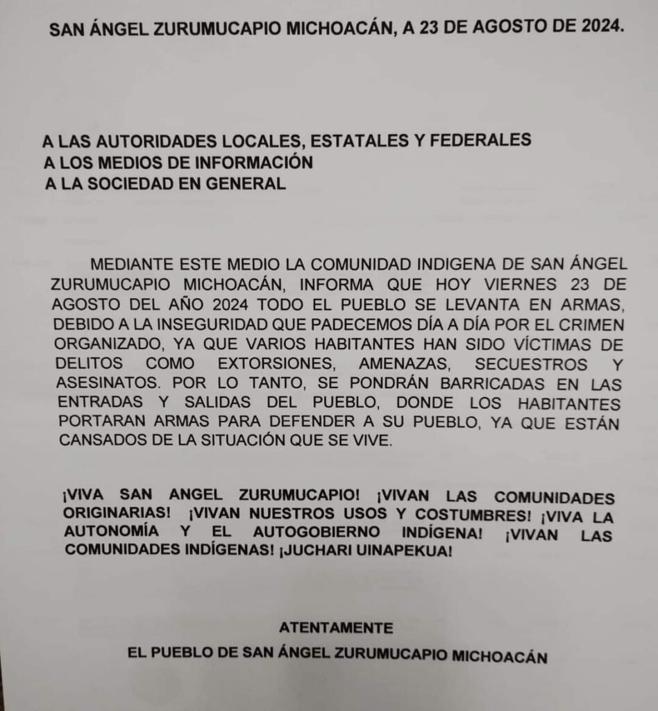 La mañana de este sábado y como consecuencia del anuncio de la población de San Ángel Zurumucapio, el Gobierno de Michoacán hizo circular un comunicado que a la letra expresa: