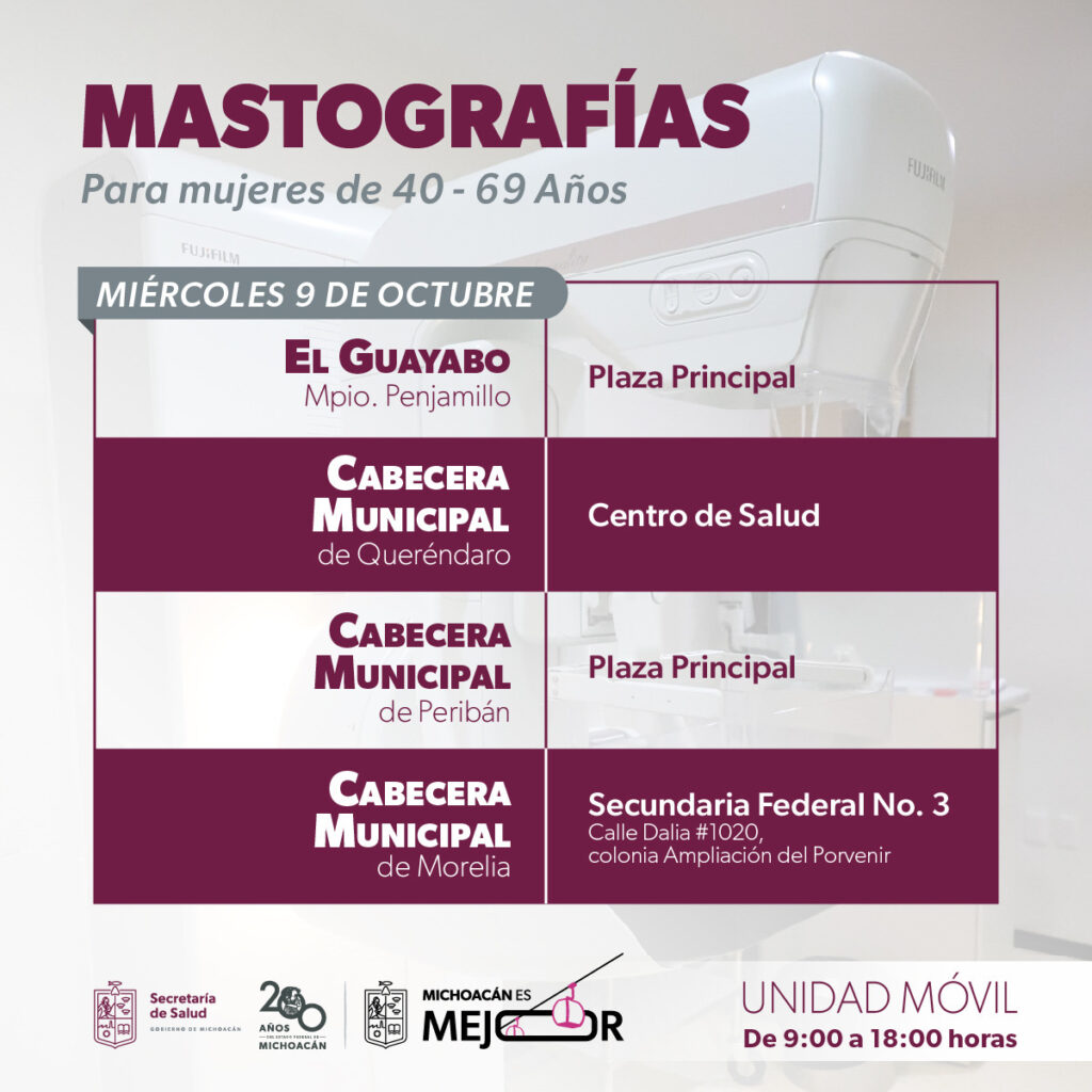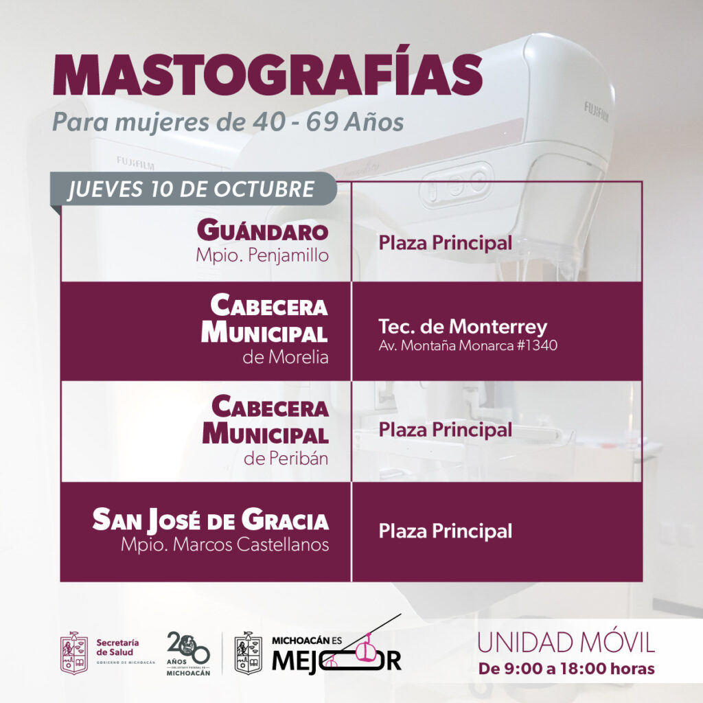 Como parte de las acciones del Mes de Sensibilización sobre el Cáncer de Mama, la Secretaría de Salud de Michoacán (SSM) ofrecerá mastografías gratuitas a mujeres de 40 a 69 años en los municipios de Churintzio, Zináparo, Penjamillo, Zinápecuaro, Queréndaro, Indaparapeo, Tancítaro, Morelia, Jacona, Marcos Castellanos y Los Reyes, del 7 al 11 de octubre.