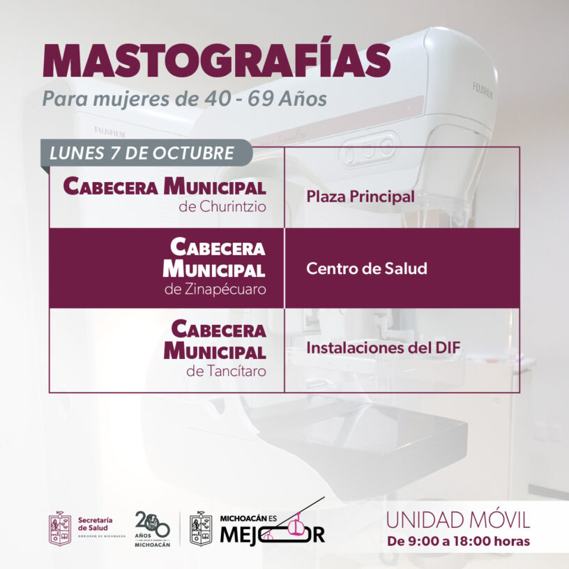 Como parte de las acciones del Mes de Sensibilización sobre el Cáncer de Mama, la Secretaría de Salud de Michoacán (SSM) ofrecerá mastografías gratuitas a mujeres de 40 a 69 años en los municipios de Churintzio, Zináparo, Penjamillo, Zinápecuaro, Queréndaro, Indaparapeo, Tancítaro, Morelia, Jacona, Marcos Castellanos y Los Reyes, del 7 al 11 de octubre.