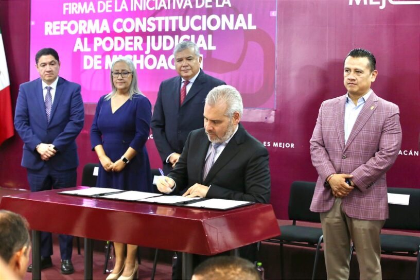 “Michoacán es el primero de los 32 estados en presentar esta reforma local, la cual propone que las juezas, jueces, magistradas y magistrados sean electos por voto universal, directo y secreto por el pueblo, además de que se respetan los derechos laborales del personal del Poder Judicial, así como la carrera judicial para ocupar los puestos que van desde escribiente hasta secretario de acuerdos”, refiere el comunicado de prensa oficial.