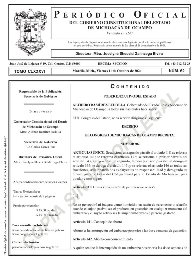 El Periódico Oficial del Gobierno del Estado publicó hoy el Decreto por el cual se establece que el aborto será legal en Michoacán durante las primeras 12 semanas de gestación.