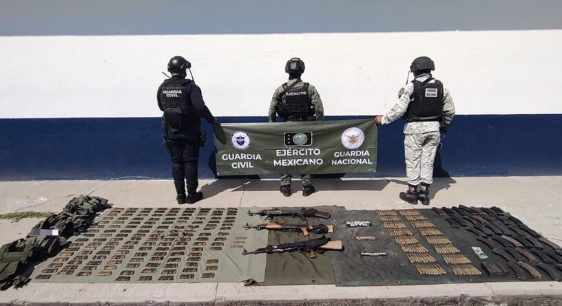 Recorridos preventivos, patrullajes y barridos de reconocimiento efectuados por parte de elementos de las secretarías de Seguridad Pública (SSP), y de la Defensa Nacional (Sedena), así como de la Guardia Nacional (GN), dieron como resultado el aseguramiento de tres fusiles, mil 620 cartuchos útiles, 42 cargadores, tres chalecos tácticos y una fornitura porta cargador.
