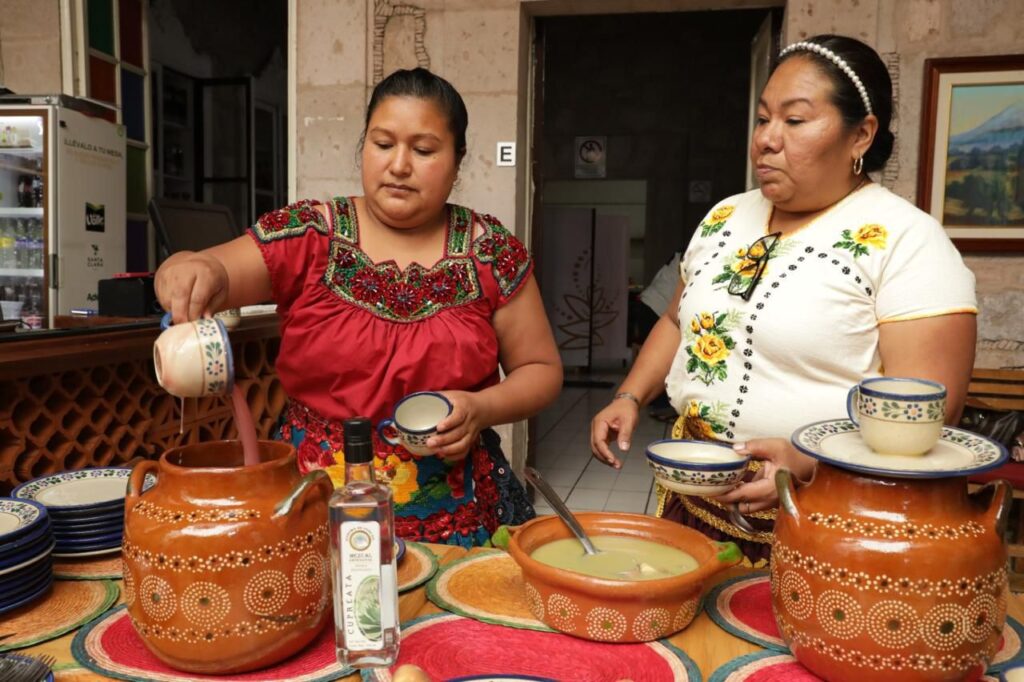 La guardiana de los sabores y saberes explicó que para preparar el atole se requiere de la combinación de la flor de cempasúchil, puskua (harina) de maíz, agua, leche, piloncillo y canela, todo se mezcla y se coloca al fuego en ollas de barro, las cuales dan un mejor sabor a los alimentos.