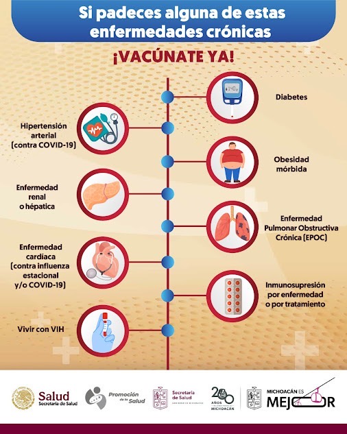 A fin de prevenir complicaciones a la salud durante la temporada invernal, la Secretaría de Salud de Michoacán (SSM) recomienda a la población con obesidad, diabetes, hipertensión, VIH o enfermedades renal, cardiaca o renal, vacunarse contra la influenza y COVID-19.