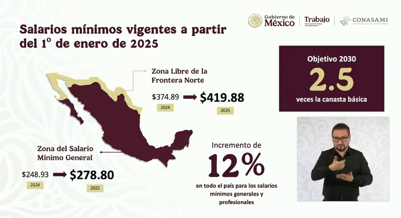 A partir del primer minuto de enero del 2025, el salario mínimo en México será de 278.88 pesos diarios, lo que equivale a 8 mil 364 pesos al mes.