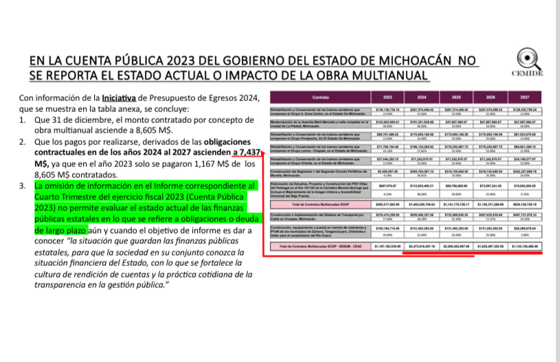 La ausencia de información sobre los recursos oficiales destinados al programa de obras multianuales, impiden conocer el impacto que ese proyecto tendrá en las finanzas estatales para los años 2025, 2026 y 2027, afirmó el Centro Michoacano de Evaluación (Cemide).