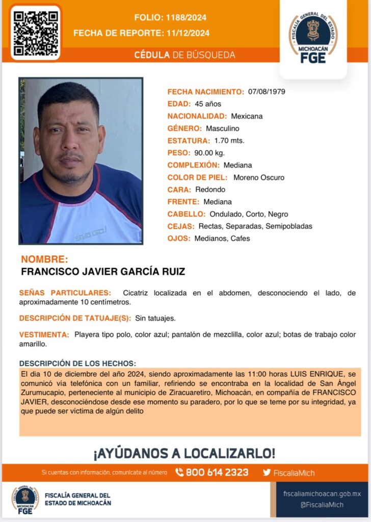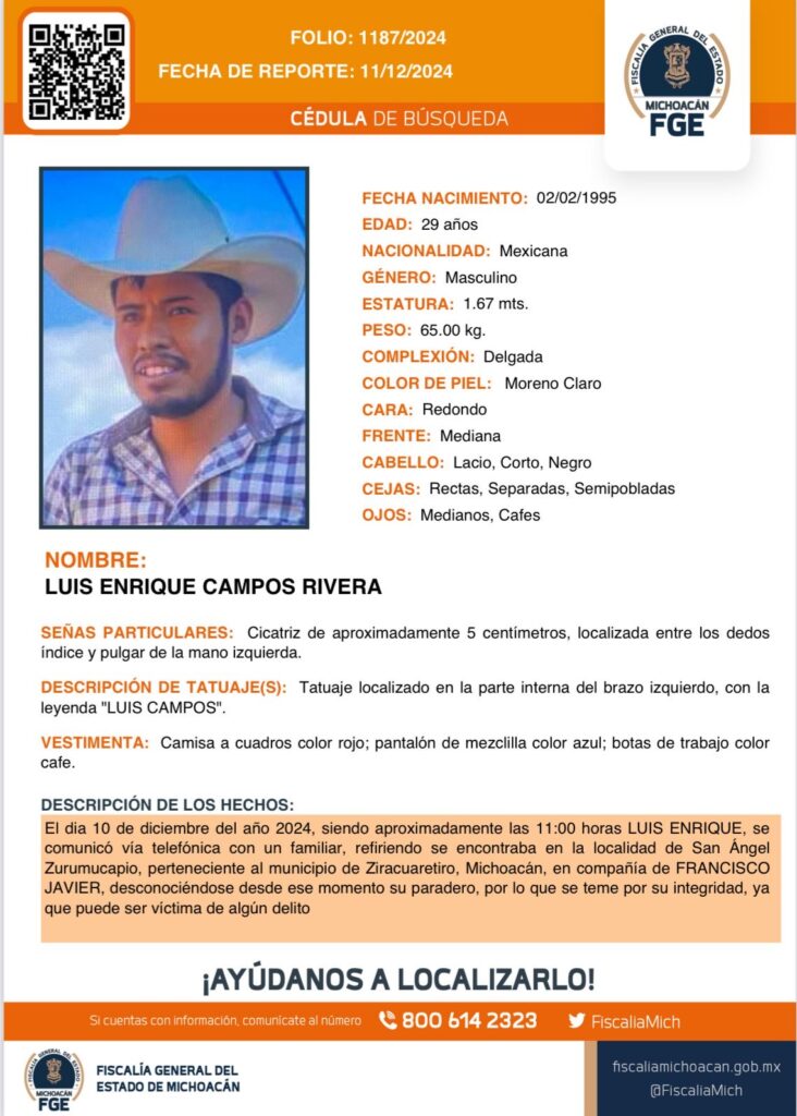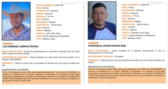 La Fiscalía General del Estado (FGE) emitió las respectivas cédulas de búsqueda en las que se dio a conocer qué Luis Enrique Campos Rivera y Francisco Javier García Ruiz se comunicaron con sus familias sobre las 11:00 horas del martes 10, indicando que se encontraban en San Ángel Zurumucapio y desde entonces nada se sabe de ellos.