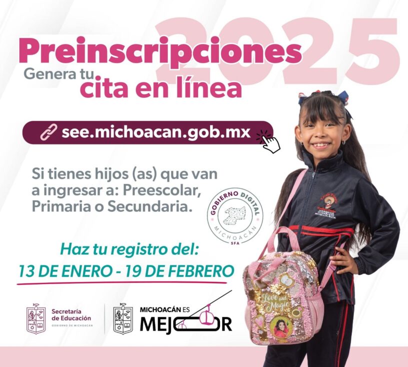 Del 13 al 31 de enero de 2025 se habilitará la página https://dti.see.michoacan.gob.mx/sistema-integral-see/preinscripciones, para que únicamente con la CURP del alumno, datos de contacto del padre, madre o tutor y de la escuela a la que se quiere ingresar, se saque la ficha para después entregar los papeles físicamente en el plantel.