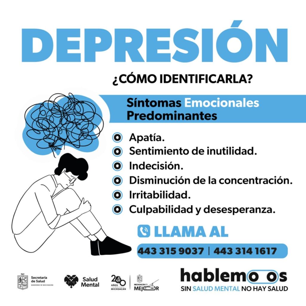 El 24 y 25 de diciembre, la Secretaría de Salud de Michoacán (SSM) atenderá la depresión estacional de manera gratuita, en los teléfonos 4433341617 y 4433159037 de la línea Hablemoos, la cual opera las 24 horas del día con psicólogos especializados, así como en 40 centros de salud y en el Hospital Psiquiátrico.