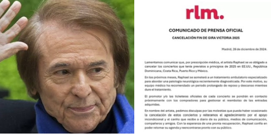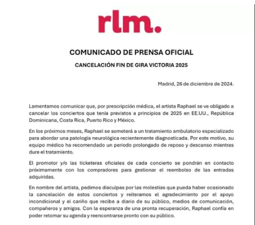 ”Lamentamos informar que, por prescripción médica, el artista Raphael se ve obligado a cancelar los conciertos que tenían previstos a principios de 2025 en Estados Unidos, República Dominicana, Costa Rica, Puerto Rico y México”, refiere el comunicado.