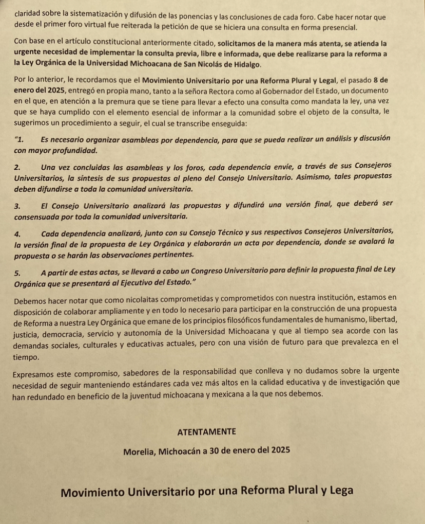 El Movimiento de Universitarios Nicolaitas por una reforma plural y legal, solicita al Congreso del Estado se amplíe el plazo para la consulta de la propuesta de reforma a la Ley Orgánica de la Universidad Michoacana, lo que les permita realizar aportaciones.