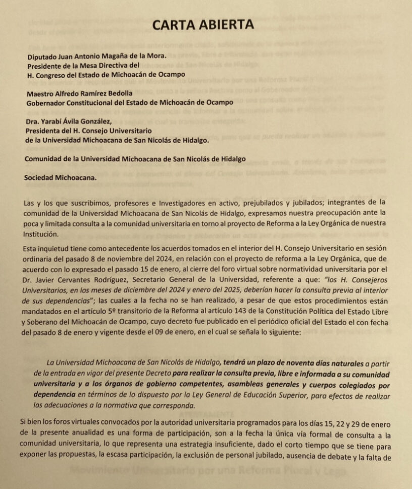 De acuerdo con integrantes de ese colectivo, integrado principalmente por académicos de la UMSNH, el tiempo que se dio para la consulta, reducido a 3 foros realizados únicamente vía cibernética, es muy limitado, aunado a que se restringió el acceso a sectores como el de jubilados además de que el grueso de los estudiantes se encuentran en periodo vacacional.