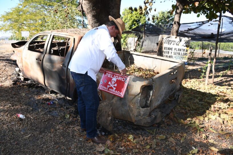 “Es una forma de protestar para que el gobierno sepa que toda la gente está a merced del crimen organizado, de los maleantes, y desde aquí queremos alertar también a los mismos militares”, indicó el dirigente priista, tras colocar letreros en este municipio en los que advierte el riesgo que enfrenta la población al transitar por zonas minadas.