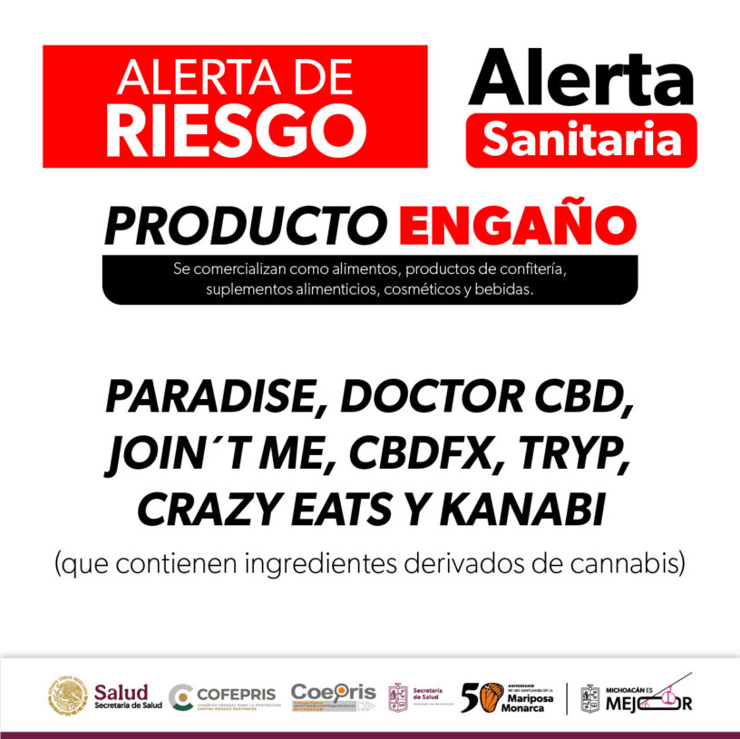 Alerta la Comisión Federal para la Protección contra Riesgos Sanitarios (COFEPRIS) a través de la Secretaría de Salud de Michoacán (SSM), sobre la comercialización ilegal de productos que contienen CBD, extracto de cáñamo y/o aceite de hemp, los cuales representan un riesgo para la salud pública.