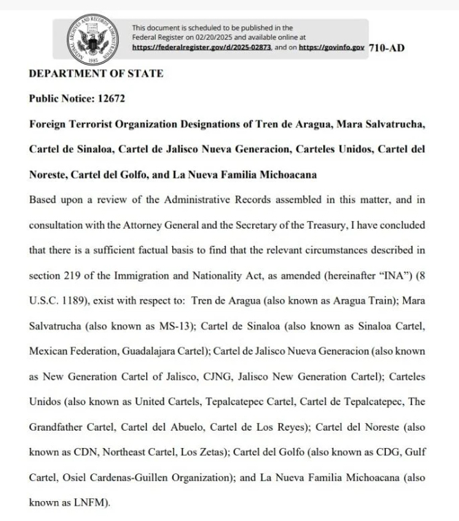 Además, el gobierno de Trump ubica como organizaciones terroristas al Tren de Aragua, de Venezuela, y a la Mara Salvatrucha de El Salvador.
