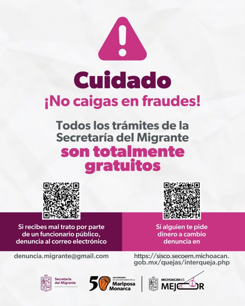 Para denunciar cualquier cobro indebido, queja o irregularidad en la atención, la ciudadanía puede escribir al correo denuncia.migrante@gmail.com, acudir a las oficinas en Colegio Militar 230, colonia Chapultepec Norte, de lunes a viernes de 09:00 a15:00 horas, o a través del siguiente enlace https://sisco.secoem.michoacan.gob.mx/quejas/interqueja.php; en el buzón de denuncia o querella de hechos de corrupción de la Fiscalía general del Estado (FGE) en la dirección: https://www.jotform.com/form/220954470344859