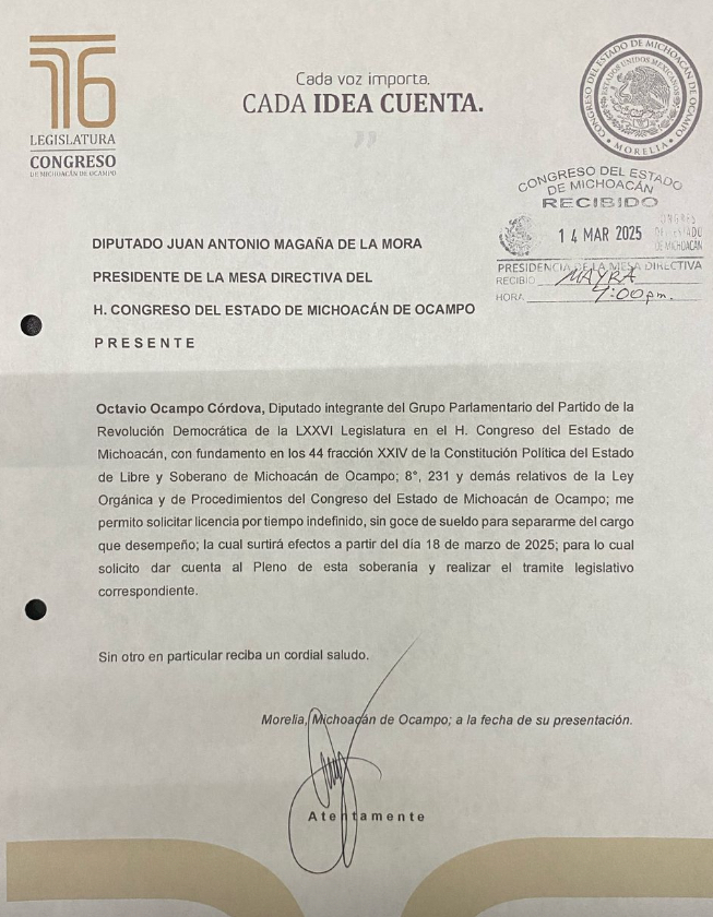 “Convencido de que el servicio público debe ejercerse con entrega y responsabilidad, Octavio Ocampo Cordova ha decidido solicitar licencia como diputado local para enfocarse de tiempo completo en la dirigencia estatal del PRD Michoacán, por lo que presentó dicha solicitud a la Mesa Directiva de la 76 legislatura del Congreso del Estado.
