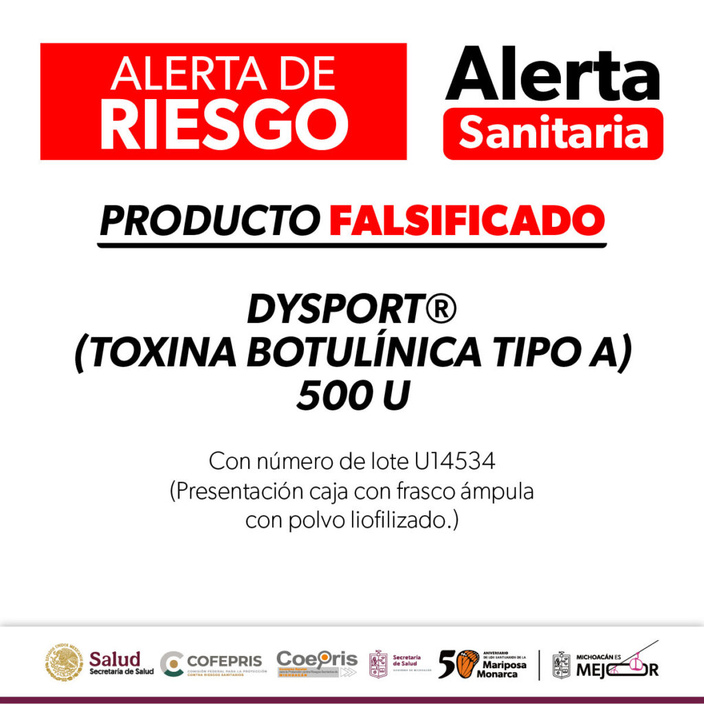 La Comisión Federal para la Protección contra Riesgos Sanitarios (Cofepris) a través de la Secretaría de Salud de Michoacán (SSM), alerta a la población sobre la presencia de productos falsificados y adulterados del medicamento DYSPORT®️ (Toxina botulínica tipo A) 500 U, que representan un riesgo para la salud.