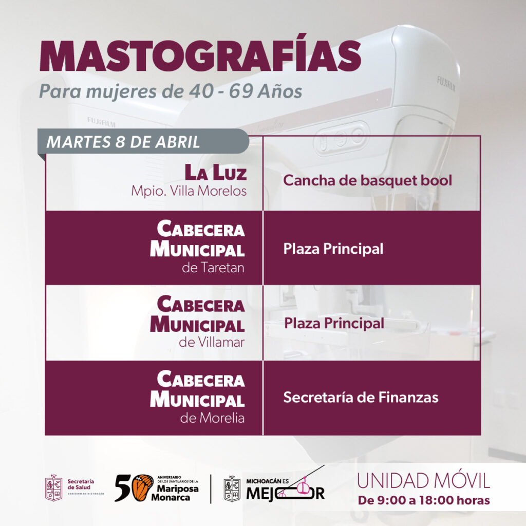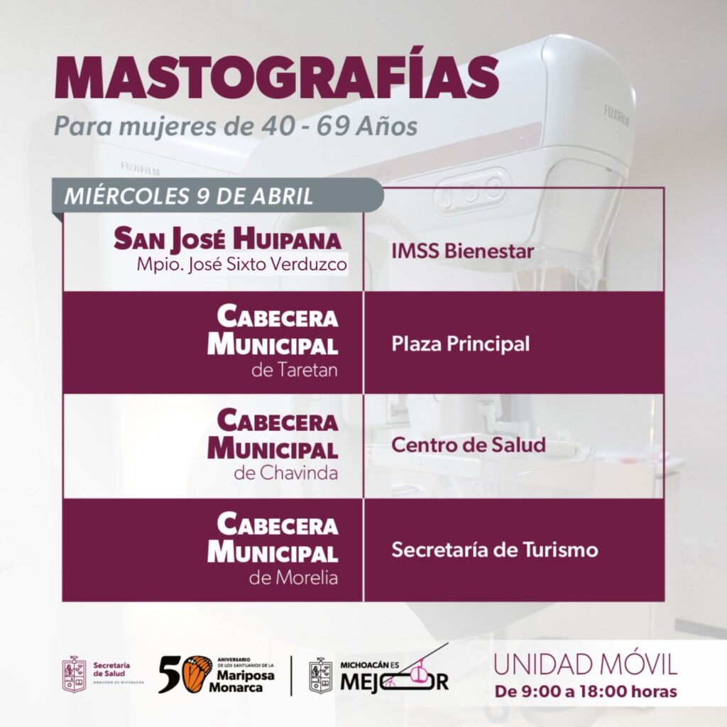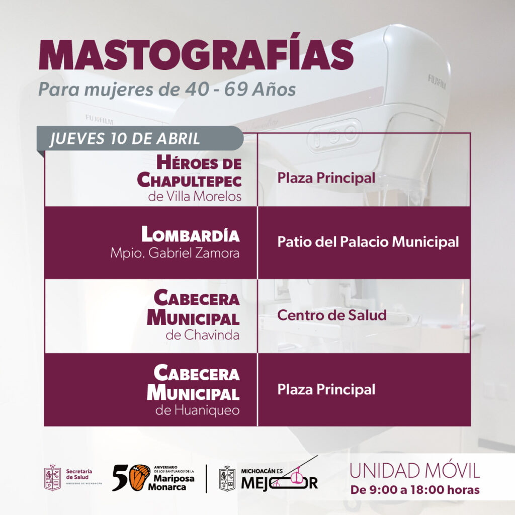 Unidades móviles de mastografía de la Secretaría de Salud de Michoacán (SSM) recorrerán del 8 al11 de abril, 10 municipios para realizar estudios de mama gratuitos a mujeres de 40 a 69 años.
