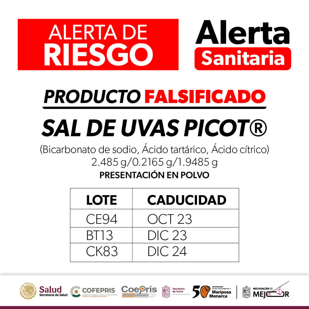 Dio a conocer la Comisión Federal para la Protección contra Riesgos Sanitarios (Cofepris), a través de la Secretaría de Salud de Michoacán (SSM) que se ha identificado la falsificación del producto Sal de Uvas Picot®️ (Bicarbonato de sodio, Ácido tartárico, Ácido cítrico) en polvo, en presentación de 2.485 g/0.2165 g/1.9485 g.