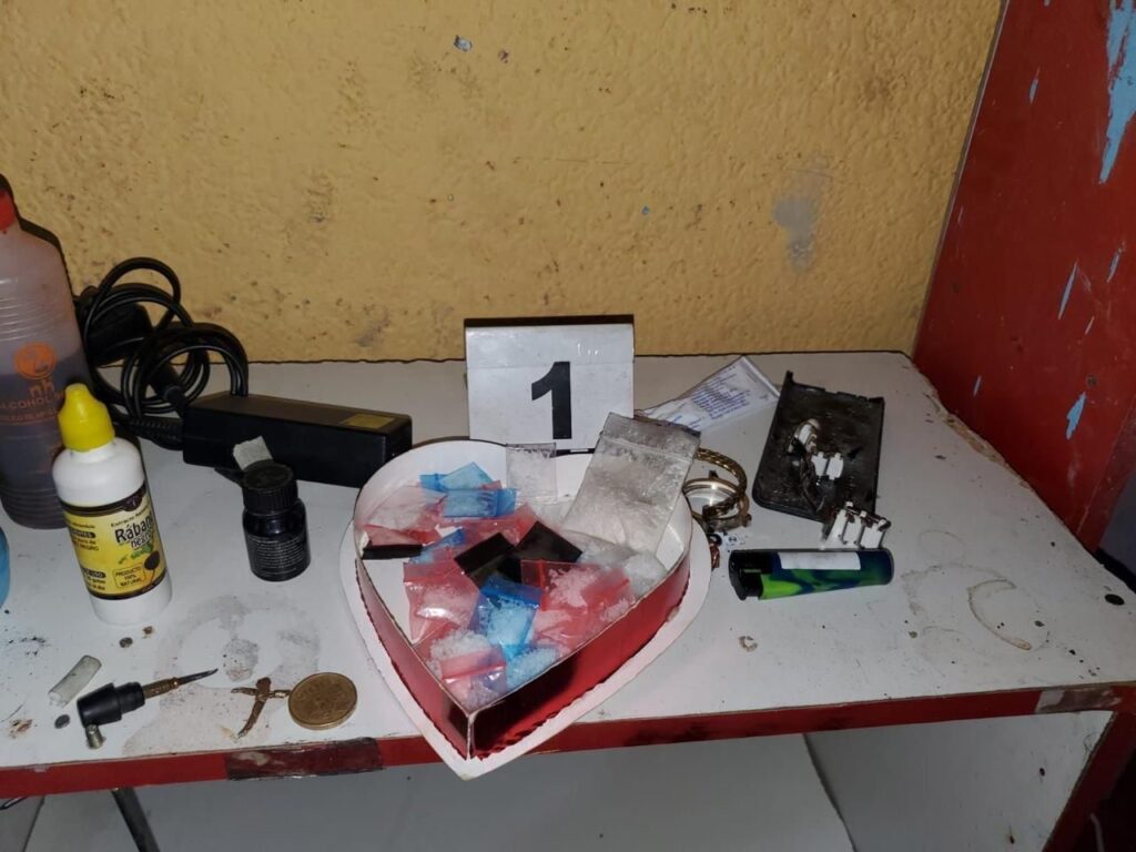 Durante la ejecución del primer cateo, realizado en un inmueble ubicado en la calle Pino de Michoacán, en la colonia Los Pinos, agentes de la Policía de Investigación (PDI) aseguraron 56 bolsas con una sustancia granulosa cristalina, con características propias de la metanfetamina, con un peso equivalente a 875 dosis, así como 119 dosis de una sustancia verde seca, con características similares a la marihuana.