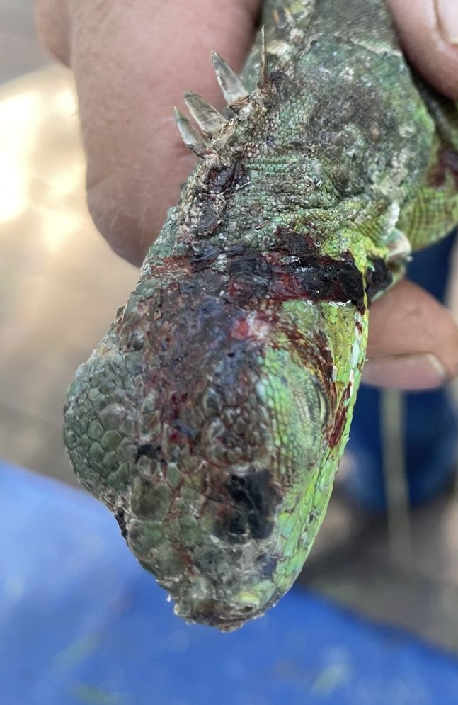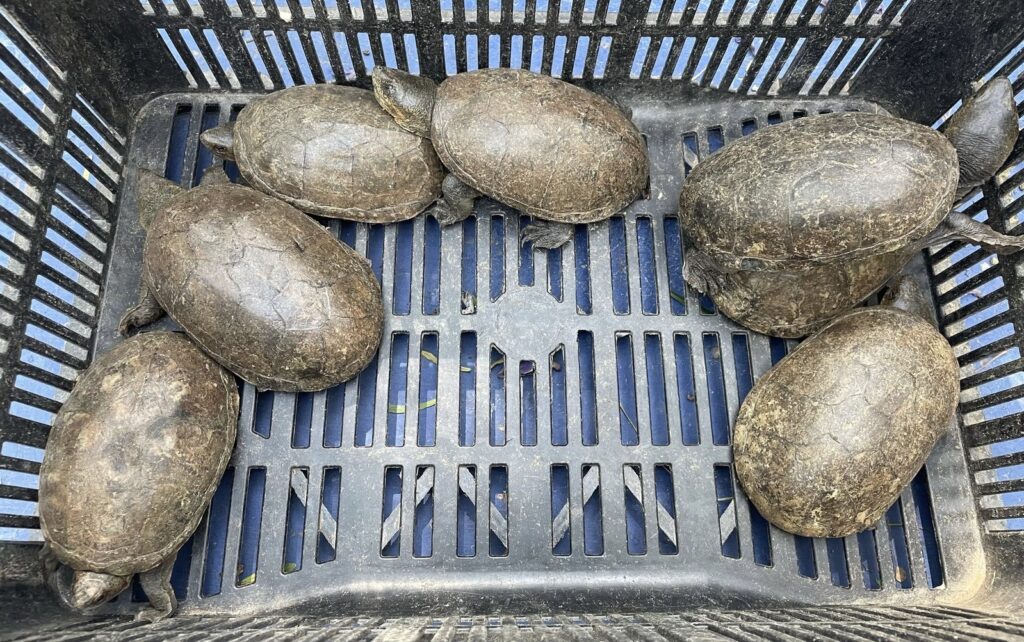 En cuanto a los reptiles, se decomisaron cuatro iguanas verdes, 19 tortugas pavo real y siete tortugas casquito, que se encuentran en aparente buen estado de salud, a excepción de una iguana que viene con una lesión atrás del cráneo.