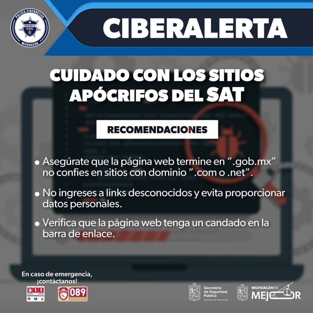 A través de las labores de monitoreo e investigación de los elementos de la Policía Cibernética de la Guardia Civil, detectaron probables estafas a través de páginas web que usurpan la identidad del Sistema de Administración Tributaria (SAT).