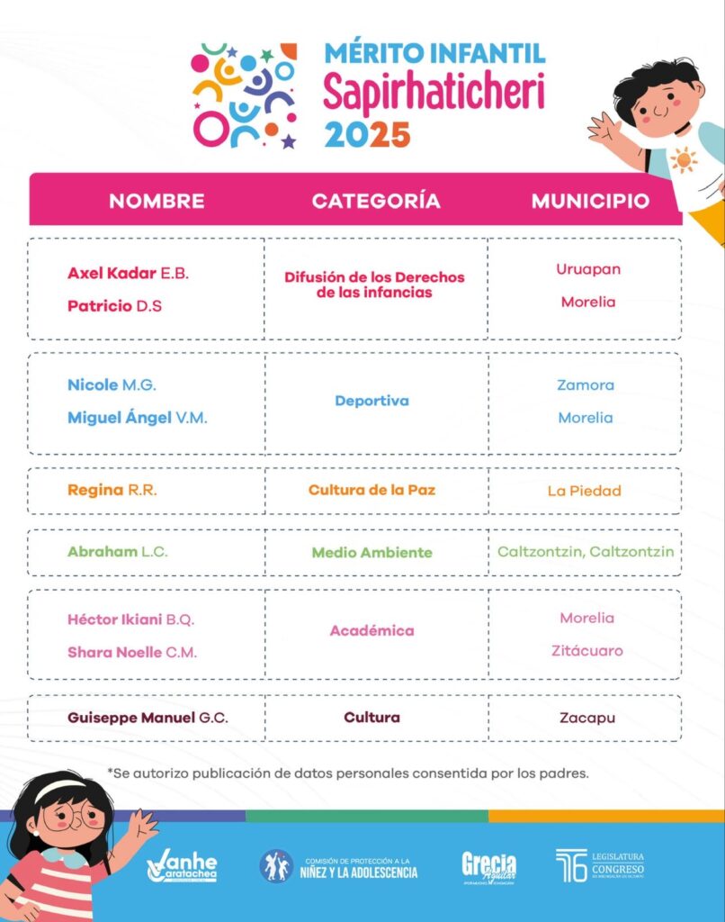 Con el propósito de reconocer, visibilizar y premiar a niñas y niños michoacanos que han demostrado liderazgo, valores y acciones destacadas en favor de sus comunidades, este día, el Congreso del Estado dio a conocer a las y los ganadores del Mérito Infantil “Sapirhaticheri” 2025.