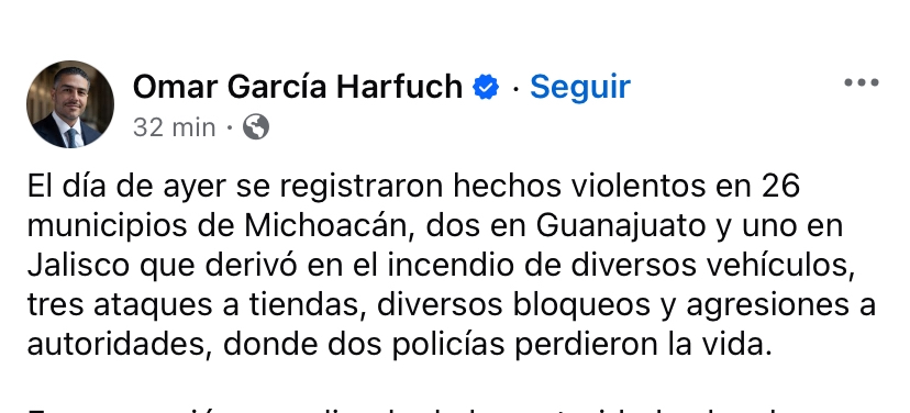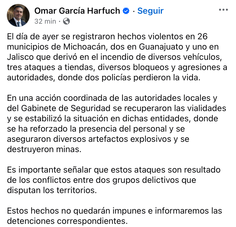 ”El día de ayer se registraron hechos violentos en 26 municipios de Michoacán, dos en Guanajuato y uno en Jalisco que derivó en el incendio de diversos vehículos, tres ataques a tiendas, diversos bloqueos y agresiones a autoridades, donde dos policías perdieron la vida.