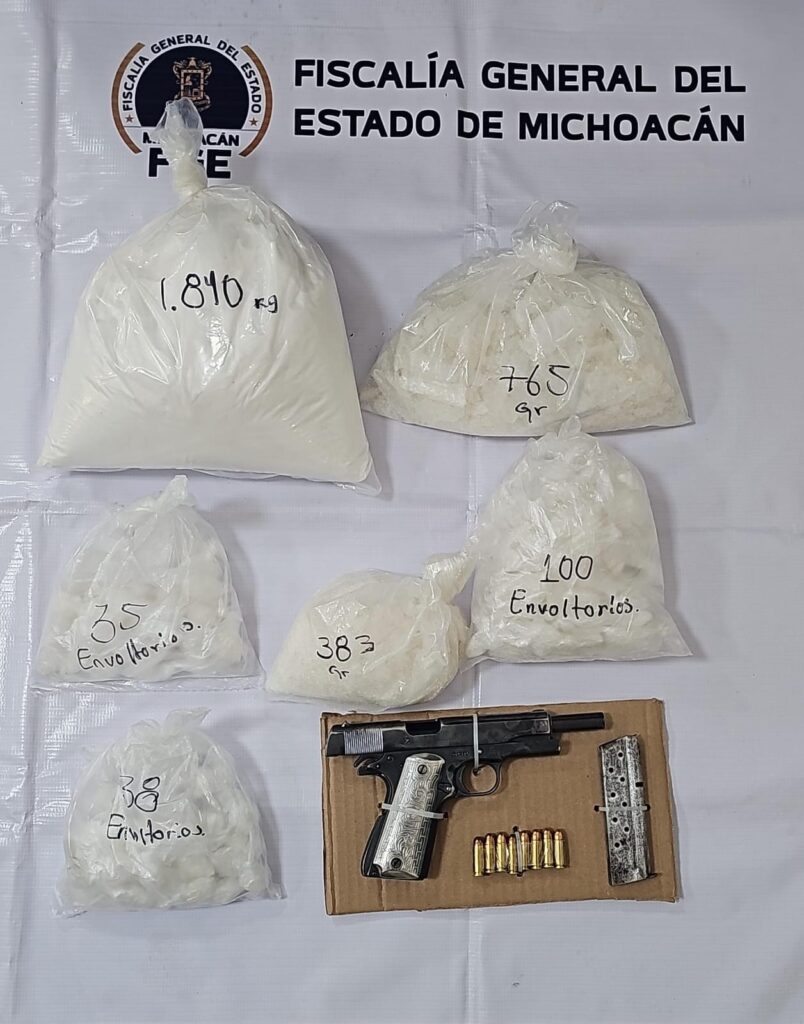 Detuvo la Fiscalía General del Estado de Michoacán (FGE) a un hombre en posesión de un vehículo con reporte de robo, un arma de fuego y sustancia con las características de la metanfetamina, en el municipio de Lázaro Cárdenas.