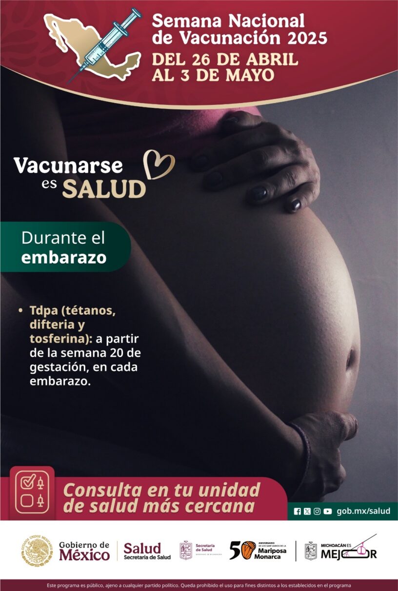 En el marco de la Semana Nacional de Vacunación, la SSM explicó que esta vacuna debe ser aplicada a partir de la semana 20 de gestación, en cada embarazo, ya que brinda anticuerpos en la madre que se transmiten al bebé a través de la placenta, dando protección durante los primeros meses de vida, cuando es más vulnerable.