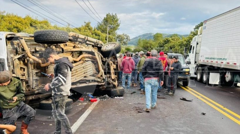 La mañana de este sábado se registró el choque de una camioneta tripulada por jornaleros agrícolas y un camión cargado con aguacate que después volcó con saldo de al menos 7 lesionados, sobre la carretera Uruapan-Los Reyes.