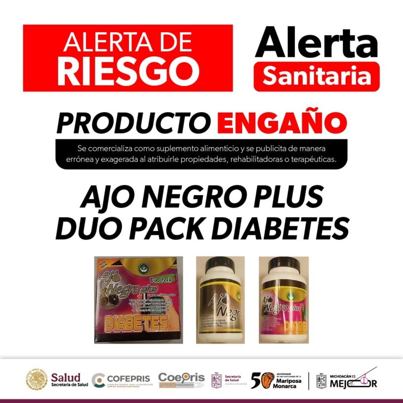 La Comisión Federal para la Protección contra Riesgos Sanitarios (Cofepris), a través de la Secretaría de Salud de Michoacán (SSM), informa a la población en general sobre la emisión de dos alertas sanitarias relacionadas con los productos Ajo Negro Plus Duo Pack y suplementos Cinco Cerritos, que se comercializan de manera irregular y representan un riesgo para la salud pública.