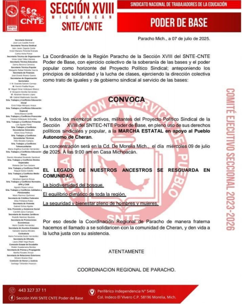 La sección Paracho de la organización sindical Poder de Base de la Sección XVIII de la CNTE, anunció que se sumará a la manifestación, por lo que se concentrarán desde las 9 de la mañana en Casa Michoacán.