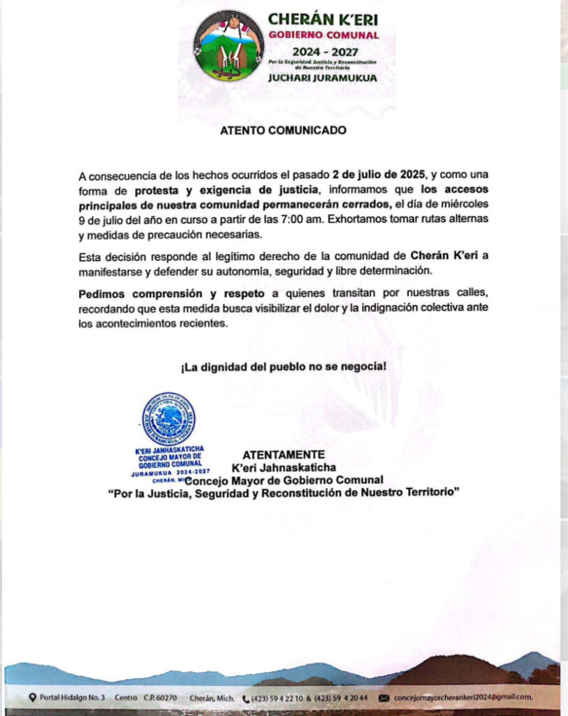 En tanto la Asamblea General de Cherán K’eri informó que los accesos y salidas de la población quedarán bloqueados, por lo que nadie podrá entrar o salir de la comunidad, a partir de las 7 de la mañana y hasta nuevo aviso.