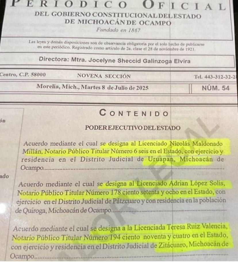 Aunque fechado el 8 de julio, apenas este lunes 14 trascendió la publicación del Periódico Oficial de Eatado de Michoacán en la que se conoce sobre la designación del aún fiscal general del Estado, Adrián López Solís, como notario No. 178, con sede en la ciudad de Quiroga.