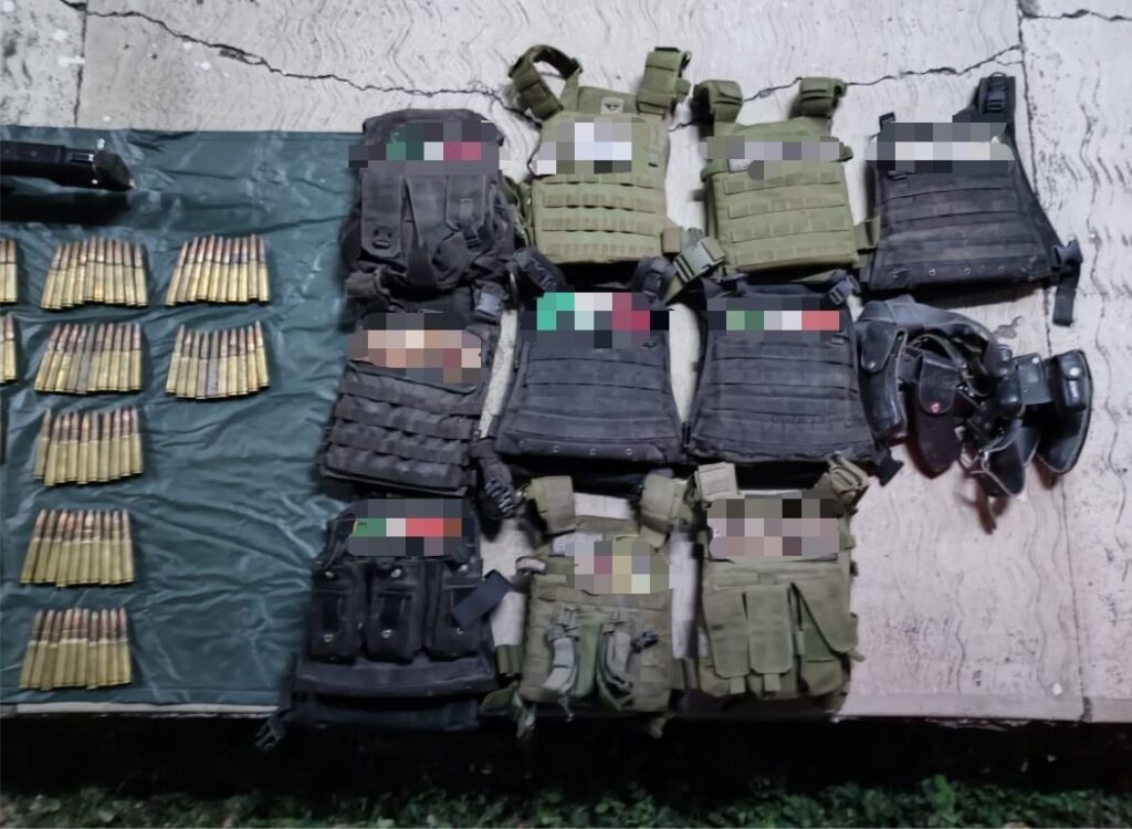 Asimismo, fueron localizados 10 chalecos balísticos y dos camionetas de la marca Ford con leyendas alusivas a una célula delincuencial. Todo lo asegurado fue presentado ante la autoridad correspondiente a fin de llevar a cabo las diligencias pertinentes.