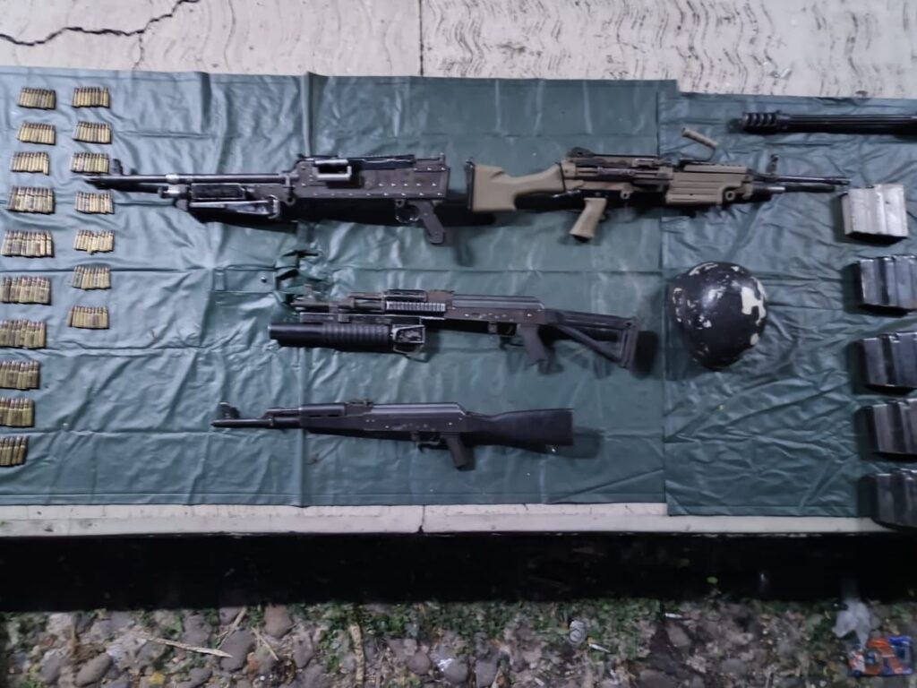 Luego de efectuar un perímetro de seguridad en la zona, los uniformados aseguraron un barret calibre .50 milímetros, dos ametralladoras, cuatro fusiles y un aditamento lanzagranadas, así como seis granadas calibre .40 milímetros, 3 mil 050 cartuchos útiles y 49 cargadores de diferentes calibres.